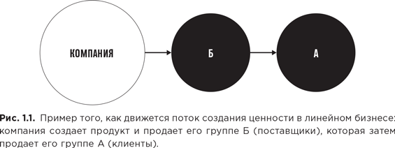 Многие современные компании также относятся к этом типу, в том числе так называемые SaaS-компании, предоставляющие программное обеспечение в пользование другим компаниям. И хотя их продукт по сути цифровой, они работают по линейной схеме, в рамках которой ценность растет по прямой от компаний к клиентам. Единственное различие заключается в том, что предельные затраты у компаний, занимающихся созданием ПО, ниже – благодаря цифровым механизмам распространения.