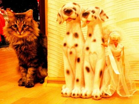 При появлении любого чужого Макс находил себе пункт наблюдения, в прихожей, и обращался в статую. Ненароком там же появилась статуэтка щенка-долматинца, в натуральный рост, и кот свободно принял его в свой театр поз и фигур. В очередной раз это едва не стоило инфаркта пришедшему мастеру по телевизорам. Макс со звонком в дверь занял своё место и замер. Мастер ввалился в дверь, обозрил всё пространство с тщанием электронщика и долго втирал мозги папе, пока Макс не пошевелился. Мастер отпрыгнул назад, вышибая дверь. Дверь не поддалась, а он высунул язык и сел на пол.