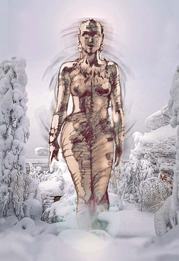…Высокая худая фигура, обретая объем и гладкость, медленно вырастала из снега. Тусклый свет зимнего солнца, пробиваясь сквозь заснеженные кроны, ложился на черное тело женщины.