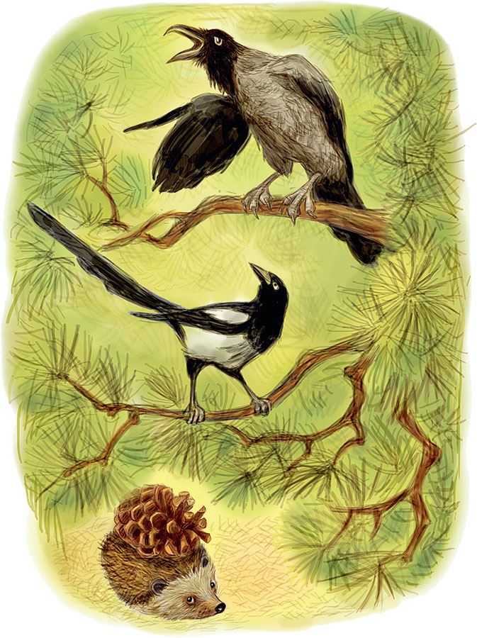 – Вечно ты лезешь не в своё дело, ворона! – недовольно проворчал барсук. – Так что, ёжик, отдашь мне шишку или нет?