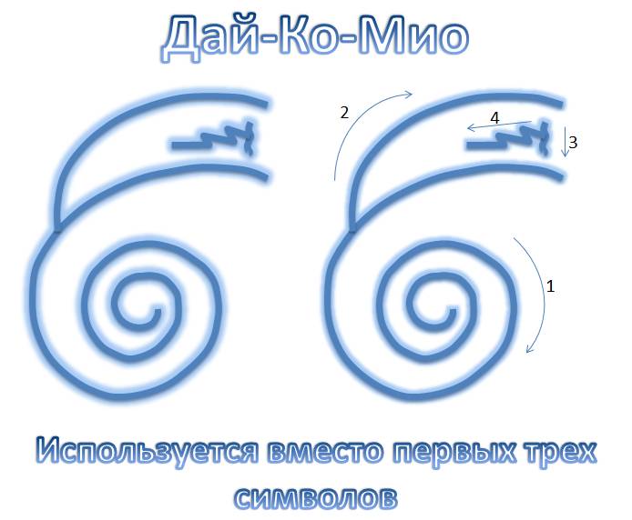 Теперь перед проведением сеанса Рейки вам будет достаточно нарисовать три раза символ «Дай-Ко-Мио», и начать проводить сеанс. Первые три символа рисовать будет уже необязательно: он работает вместо них.