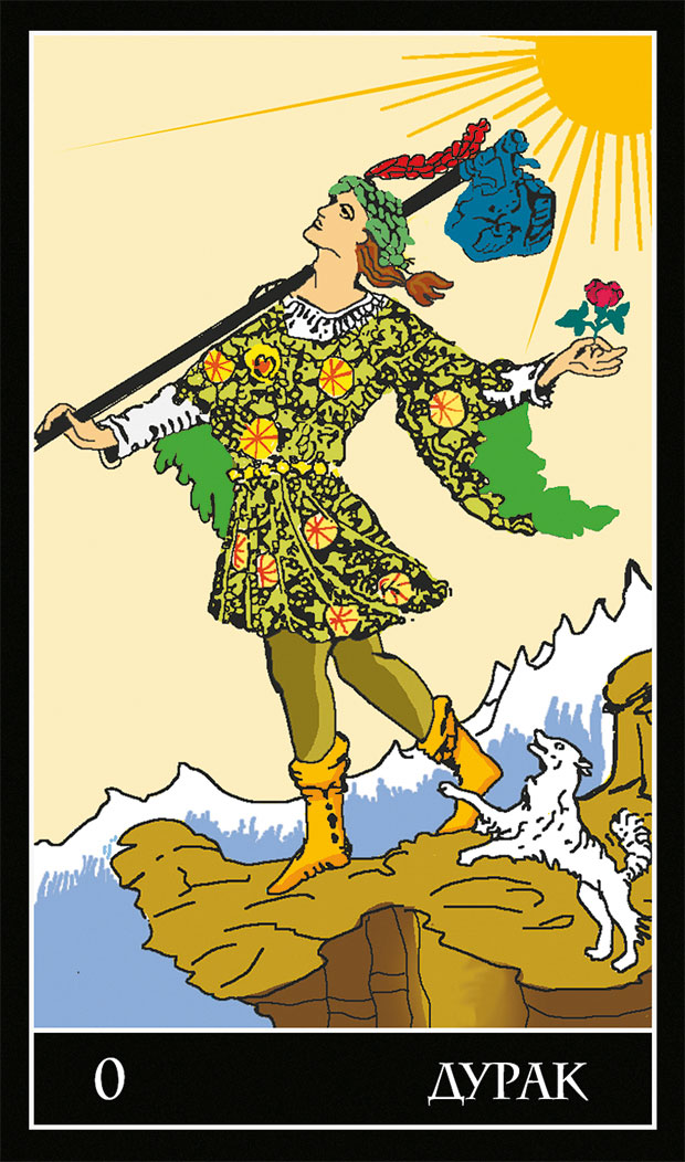 Небольшой узелок Шута – символ начала. Шут еще не накопил ни знаний, ни опыта, ни материальных ценностей. Некоторые тарологи считают, что у Шута в узелке атрибуты Мага – жезл, меч, кубок и пентакль, – но он пока не умеет ими пользоваться. Шут – это чистый лист.