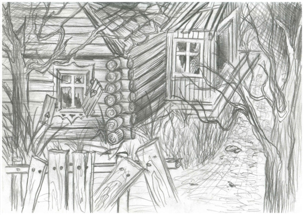 Из-за пригорка показался первый дом. Распахнутые ворота. Выбитые окна. Перекошенные ставни. Над колодцем топорщился деревянный аист с перебитой цепью. Когда они подошли ближе, стало понятно, что ворот просто нет. Опустевший двор будто перенял тишину из леса. А вместе с тишиной в дом пришло и запустение.