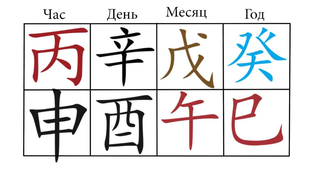 Янский Огонь 丙 звезда мужа сидит на Хранилище Собкак (Сюй) входящем введение Служебного благополучия ветви Змеи (Сы). Иньская Вода 癸 в качестве мужа и ПЧ, у иньского Металла 辛 в НС рождает в иньской Воде 癸 как потомство, которая сидит на Змее (Сы)巳, в которой также принимает участие муж и СБ в одной позиции.