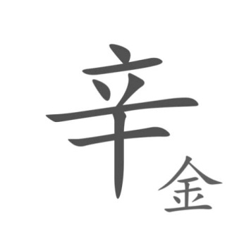 辛 следует за 庚, и является главой пяти видов Металлов на Земле, первоначально – восемью снадобьями приправ к пище, находится в Небе в виде Солнца и Луны, представляя тонкую материю, экстракт Большого Ян, на Земле в качестве Металлов, руды в скальных камнях и горах, это называют иньским Металлом.