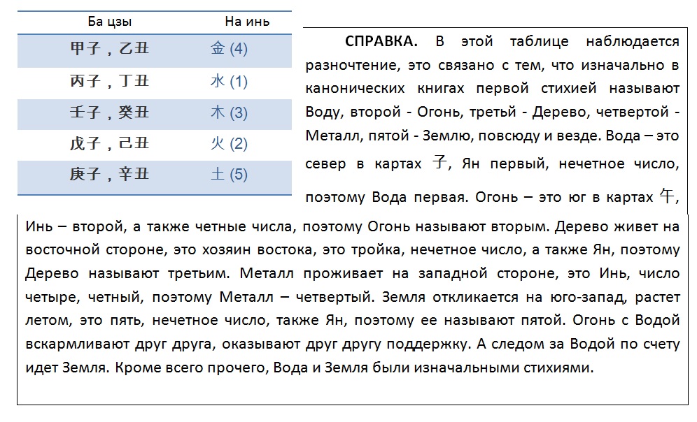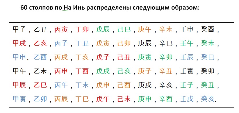 Этот расчет, приведенный в книге «三命通會» («Три судьбы встречают слияние»), показывает нам, как сделать расчет и определить, какие столпы из 60-ричного цикла будут относится к На Инь Металла, а какие – к другим стихиям На Инь. Имеем 5 элементов стихий и 60 столпов, значит по На Инь должно быть ровно по 12 столпов каждой стихии.