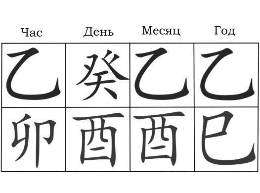 Так 【乙卯,癸未,辛酉,戊子】: здесь Синь 辛 сидит на 酉 Ю, И 乙сидит на Мао 卯, процветают и тело и Богатство, получает Гуй 癸– ДН, У Цзы 戊子– это Печать оказывающая поддержку – это судьба сказочного состояния, олигарха, знатного благородного.