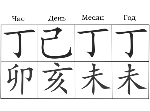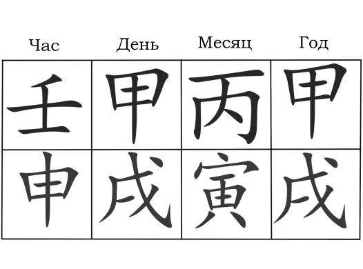 Так 【甲戌,丙寅,甲戌,壬申】:Здесь Цзя甲 видит Бин丙 – ДН, рожденный в месяц Инь, ДД – Цзя 甲обретает корни и процветает. И тело и ДН – оба в полном порядке и это жизнь благородного. Не сливается, не сходится в карте Час Рен Шэнь壬申, вода Рен壬 ранит Огонь 丙Бин, а Шэнь 申сталкивается с 寅Инь (т.е. столп часа с месяцем). Опять же у Шэнь внутри сидит 7уб. Гэн, и поэтому у ДД слава и выгода, положение и деньги будут не полны. Когда в судьбу придет такт 己巳 Джи Сы, и Металл обретет землю, в год 庚子Гэн Цзы – в Металле Гэн 庚есть 7уб. и когда он встретит 子Цзы, суждено погибнуть не своей смертью (в результате несчастного случая).