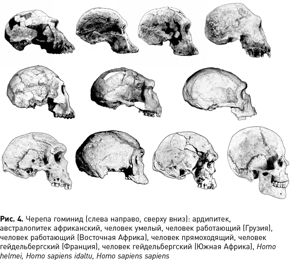 Если некто заговорит о «просто древних людях и обезьянах», предложите ему рассмотреть ряд черепов от ардипитека до Homo sapiens, представленных на рисунке 4. Затем задайте вопрос: на каком именно черепе заканчиваются обезьяны и начинаются люди? Ответ попросите обосновать. Вероятнее всего, в этот момент ваш оппонент перестанет самоуверенно рассуждать и начнет думать.