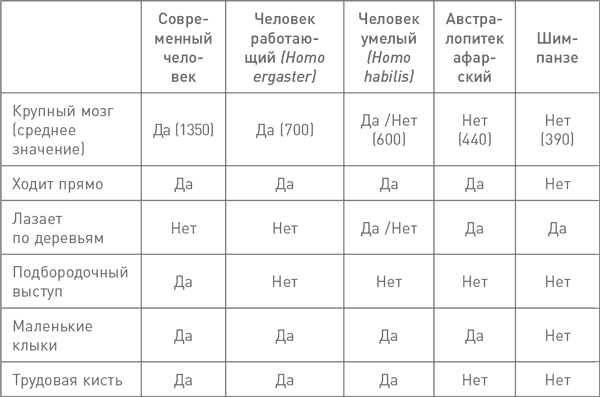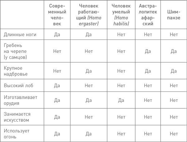 Для наглядности ниже приведена таблица, где можно сравнить нескольких древних гоминид по признакам, отличающим современного человека от шимпанзе. Хочу подчеркнуть, что список неполный и упрощенный: в нем для удобства смешаны анатомические, поведенческие и культурные особенности.