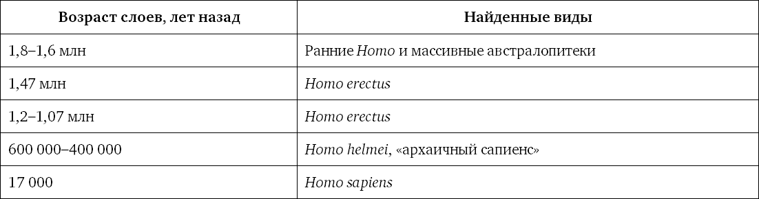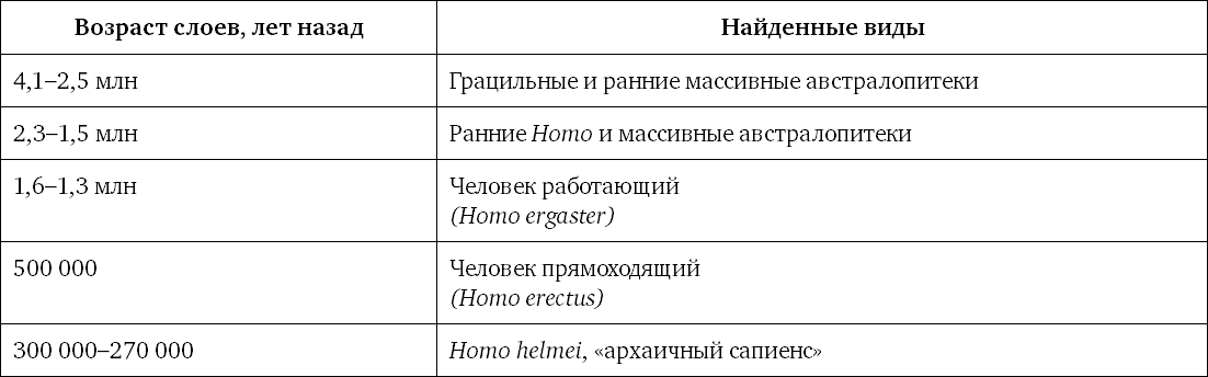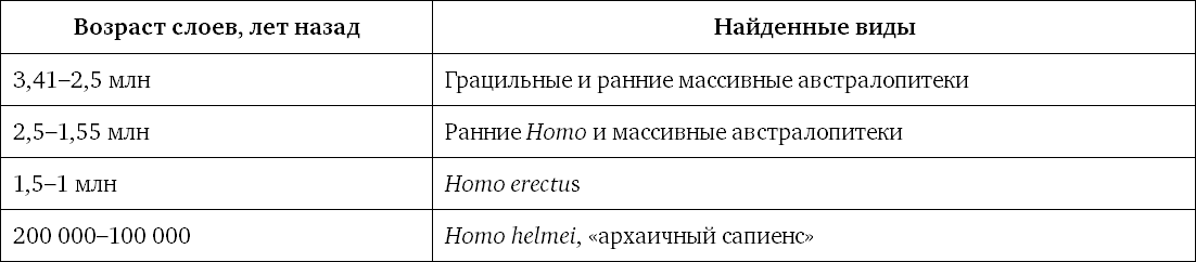 Вот, например, хронология знаменитых памятников – Кооби-Фора (Кения), Омо (Эфиопия), Олдувай (Танзания) – от древних слоев к молодым.