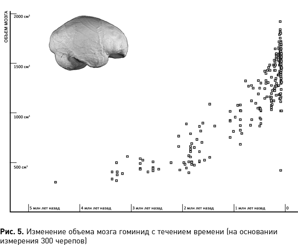 Однако для нас важны не отклонения, а магистральный путь, который легко увидеть воочию. Посмотрите на диаграмме (рис. 5), как менялся объем мозга древних гоминид с течением времени. На графике около 300 точек. Странная деградация, сопровождающаяся быстрым ростом мозга, не правда ли?