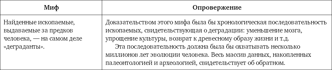 Как видим, во всех случаях на смену австралопитекам приходят ранние Homo, затем – Homo ergaster и Homo erectus, а эректусов сменяют «архаичные сапиенсы». Последовательность нигде не нарушена! Точно так же и с археологией: в слоях с австралопитеками орудий нет; рядом с ранними Homo найдены примитивные галечные орудия; выше идут более прогрессивные симметричные рубила и т. д. Налицо прогресс, а отнюдь не деградация.