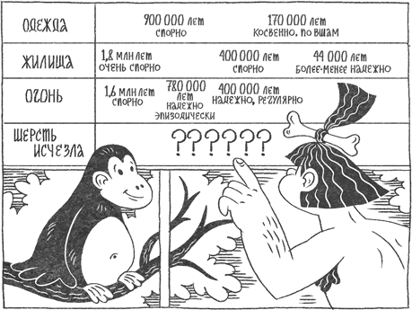Если брать только надежные свидетельства (мы же хотим твердых доказательств, верно?), то все искусственные способы защиты от холода, изобретенные людьми, заметно моложе 1 млн лет. В это время разные популяции, а точнее, разные виды людей уже осваивали просторы Евразии и, чтобы не сгинуть от холода, придумывали одежду, жилища, очаги. Допустим, волосяной покров на теле исчез в результате всех этих инноваций. Из этого следует, что: