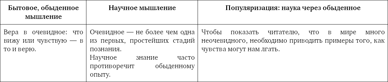 Сведения о неочевидном, противоречащем привычному нам дает наука. К примеру, мы не видим воздуха, но научный эксперимент показывает, что воздух существует. Нам кажется, что Земля плоская и находится в центре Вселенной, а звезды – сверкающие точки. Наш разум протестует против понятия Большого взрыва («А что было до него?»), нам сложно осознать, что свет имеет скорость и может «давить». А логические противоречия, порождаемые принципами квантовой механики (типа «кота Шрёдингера», живого и мертвого одновременно), способны вызвать у обывателя мигрень.