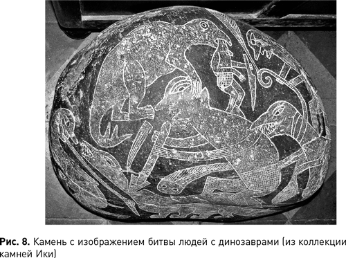 2. Камни Ики – свидетельство сосуществования человека с вымершими животными, в частности с динозаврами. Основание: распространенный среди рисунков на камнях Ики сюжет об успешной или безуспешной охоте человека на динозавров. Здесь в пространстве массовой культуры сосуществуют две интерпретации: удревнение происхождения человека с выбором Южной Америки в качестве прародины и идея о выживании динозавров в перуанских предгорьях вплоть до исторического времени. Геологическая летопись ни того, ни другого не подтверждает. Конечно, очень романтично было бы представить такой реликтовый, почти конан-дойлевский «затерянный мир», который застал «первый» южноамериканец! И нарисовал таким, каким увидел. Но среди изображений встречаются не только динозавры, останки которых найдены в Южной Америке, но и обитатели других континентов, которых древний житель Америки никак не мог увидеть. А кроме того, все эти животные, включая и южноамериканских, потому и узнаются так легко, что хорошо нам известны по классическим научным реконструкциям. Другими словами, мы узнаем в рисунках не существовавших когда-то животных, а наши представления о них. А это мало подходит в качестве убедительного аргумента в пользу предлагаемой точки зрения.