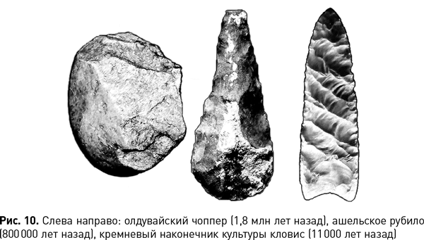 Да, темпы технической эволюции были, по нашим меркам, очень низкими, однако скорость прогресса постепенно нарастала. Судите сами: нижний палеолит продлился больше 2 млн лет; средний – 200 000 лет; верхний – 30 000 лет… Такое впечатление, что долгое время эволюция техники шла рука об руку с эволюцией биологической, столь же неспешными темпами. Но в какой-то момент, когда наши предки накопили достаточно ума, навыков и традиций, техника оставила биологию далеко позади. Можно предположить, что этому способствовало не вмешательство инопланетян (как в фильме Кубрика), а развитие языка: людям стало гораздо удобнее обмениваться опытом. Теперь знания, полученные одним из членов сообщества, не терялись, а могли передаваться соплеменникам, и их накопление пошло быстрее и эффективнее.