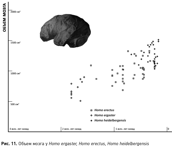 В результате десятки «антропов» упразднили, разжаловали в подвиды и многих загнали под вывеску Homo erectus. Но вы, мой читатель, должны понимать, что вид от такой операции не застыл – просто решением ученых расширились его границы. Находки, несмотря на смену этикетки, остались такими, какими были. Это видно на диаграмме эволюции размеров мозга. Если мы расположим черепа эректусов на оси времени (см. рис. 11), то увидим колоссальный разброс объема мозга – от менее чем 800 см³ у ранних представителей до почти 1300 см³ у поздних. Мы увидим также, как на одном полюсе ранние эректусы сливаются с эргастерами, а на другом плавно перетекают в гейдельбергских людей. И оказывается, в зазор между этими четко определяемыми видами помещаются находки, которые в равной степени можно записать в обе группы. И ведь записывали! (Мы еще коснемся этого вопроса в мифе № 20.)