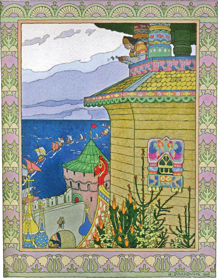 Вот и сине море – широкое и раздольное – разлилось перед нею, а там вдали как жар горят золотые маковки на высоких теремах белокаменных. «Знать, это царство Финиста ясна сокола!»