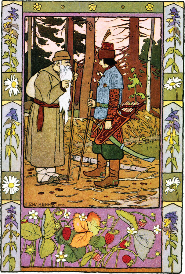 Шёл он близко ли, далеко ли, долго ли, коротко ли – попадается ему навстречу старый старичок. «Здравствуй, – говорит, – добрый мо́лодец! Чего ищешь, куда путь держишь?»