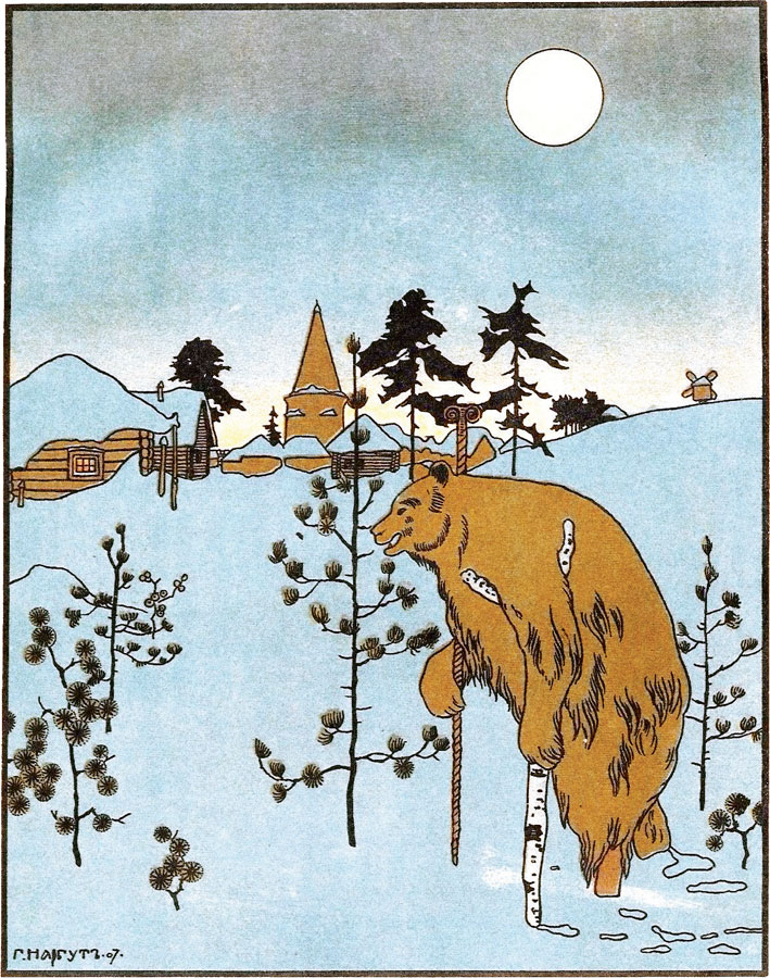 Скрипи, нога,Скрипи, липовая!И вода-то спит,И земля-то спит,И по селам спят,По деревням спят;Одна баба не спит,На моей коже сидит,Мою шёрстку прядёт,Моё мясо варит,Мою кожу сушит.Иллюстрация к сказке «Медведь». Художник В. Нарбут