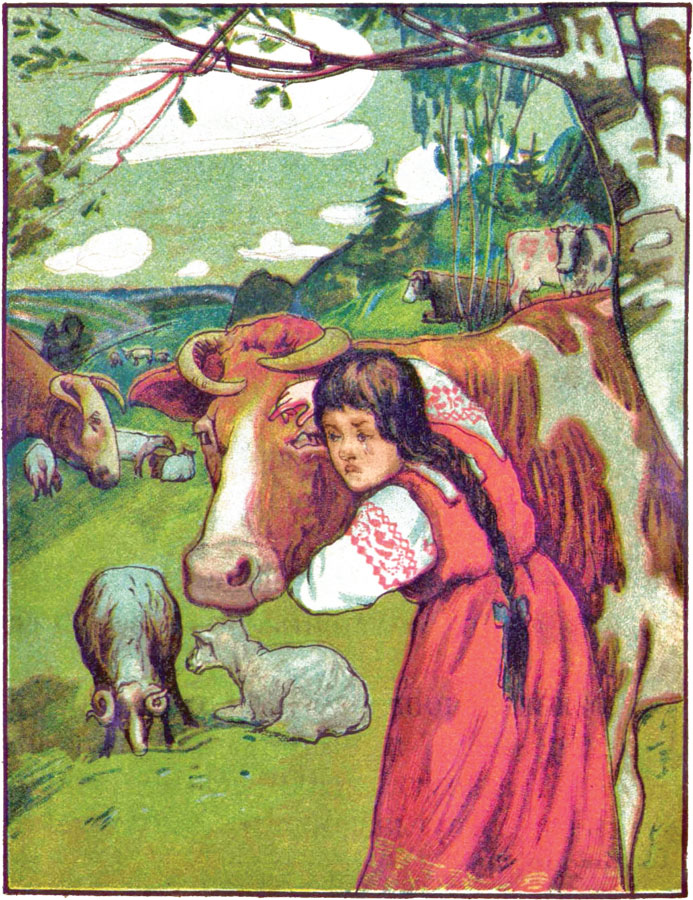Выйдет, бывало, Крошечка-Хаврошечка в поле, обнимет свою рябую корову, ляжет к ней на шейку и рассказывает, как ей тяжко жить-поживать: «Коровушка-матушка! Меня бьют, журят, хлеба не дают, плакать не велят. К завтрему дали пять пудов напрясть, наткать, побелить, в трубы покатать».