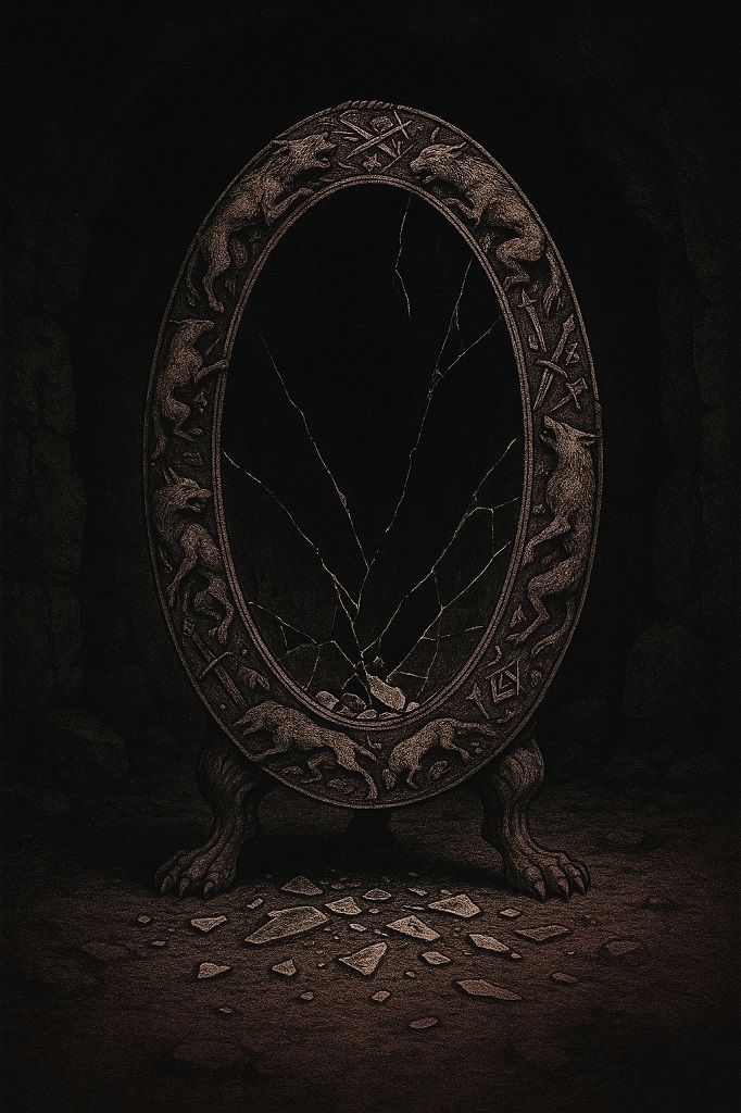 Напротив входа, у края этого круга, но не нарушая его границ, стояло огромное тяжелое зеркало с мутным стеклом. Овальной формы, немногим выше человеческого роста, оно покоилось на трех массивных ножках в форме звериных лап. Раму же украшала резьба, изображавшая животных, похожих на чудовищных волков, их добычу, различное холодное оружие и все те же неведомые символы, что встречались в зале повсеместно.