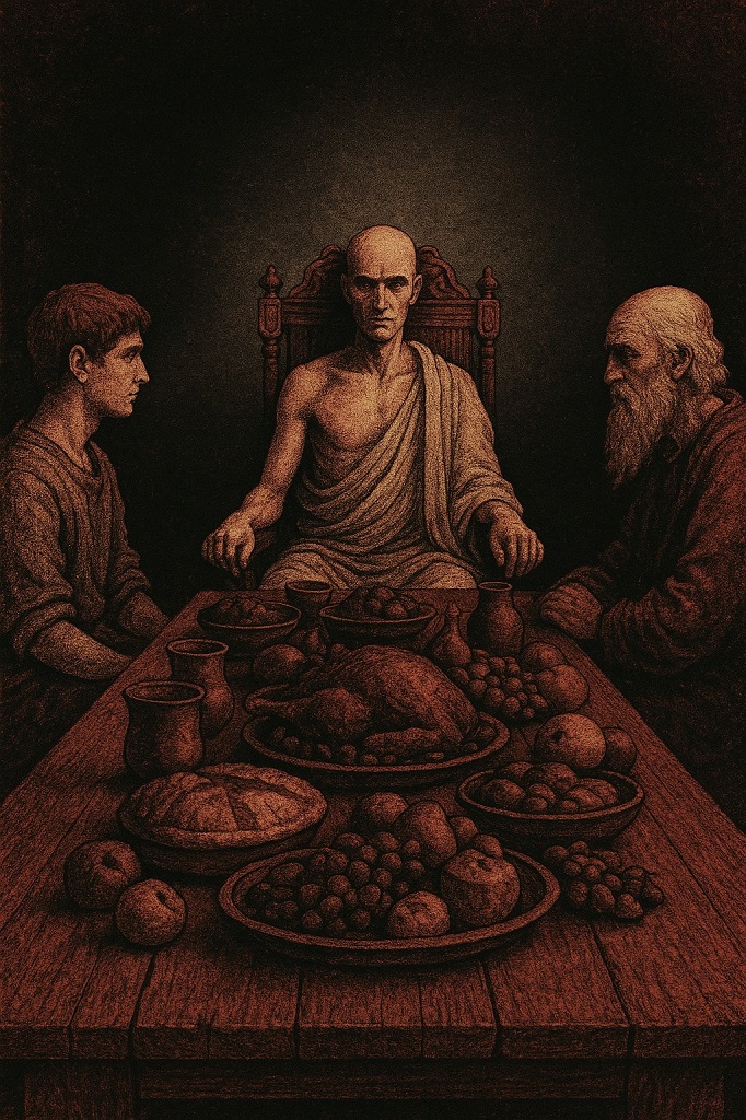 Но эту силу явно нужно было еще восстановить. Рабы довели господина до жилой части убежища. Там они омыли его тело, обернули тогой и усадили за обеденный стол (во главе которого специально стоял единственный в комнате массивный стул с высокой спинкой и подлокотниками), на который вскорости выставили всю пищу, что в данный момент имелась. Довольно скромное пиршество даже по меркам двух человек. Руза скорбно посмотрел на грибную похлебку, овощи и лепешки, вздохнул и задумчиво произнес: