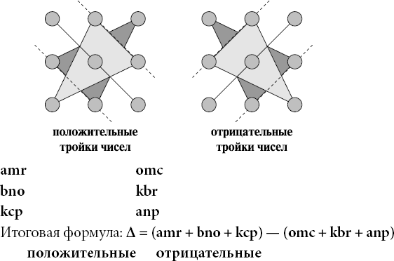 нам потребуется знание правила «треугольников», которое выглядит следующим образом. На числах матрицы 3×3 зарисовывают треугольники, вершины которых показывают, какую тройку чисел мы должны перемножить друг с другом: