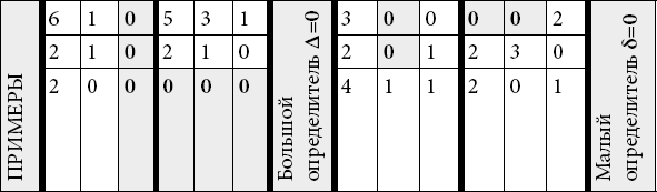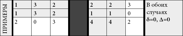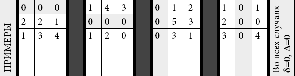Однако тем и хороши математики, что, придумав заморочку, всегда находят более легкие пути ее обхода. Именно поэтому спешу вам сообщить, что существует несколько достаточно простых правил (способов), помогающих с одного взгляда, без утомительных расчетов сказать, что данный большой определитель равен нулю (Δ = 0). Заметим, что все правила применимы и к малому определителю. Итак,