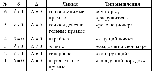 Так как малый определитель для различных матриц может принимать три разных значения, а большой определитель мы учитываем только в двух вариантах, тогда совместное их использование дает нам всего шесть возможных вариантов их сочетания, что полностью совпадает с числом линий второго порядка, которые мы рассматривали в предыдущей главе.