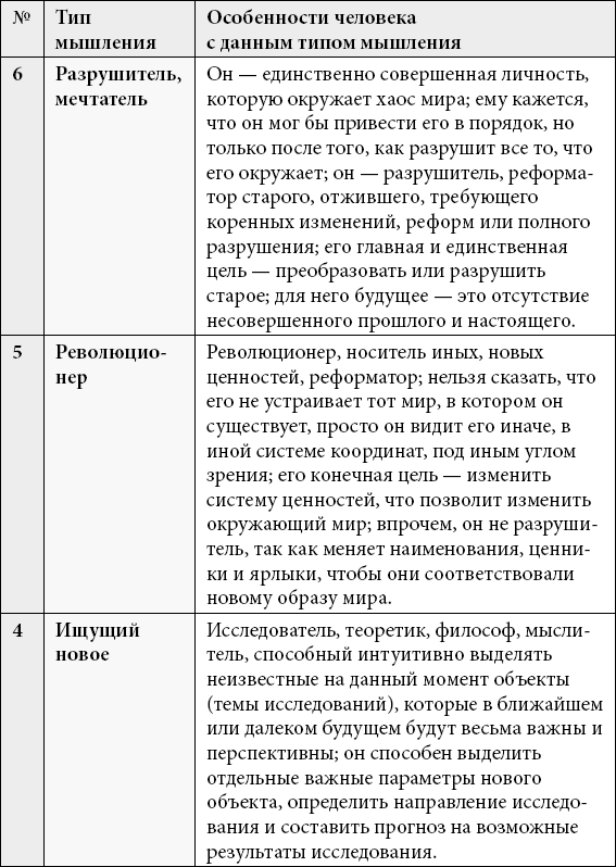 Остается составить таблицу всех вариантов, а точнее, типов мышления, которые ради удобства мы будем именовать следующим образом: