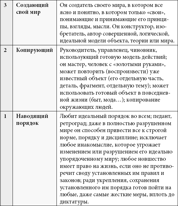 Как вы можете видеть из таблицы, самый низкий уровень наличия новых идей имеет тип «наводящий порядок». Самым высоким реальным уровнем становится тип «революционер», так как тип «бунтарь» – перегруженный, требующий особых условий для своего проявления.