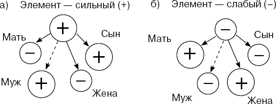 В основе нашего анализа имеется предположение, что элемент Огонь должен активизироваться (усилиться, +, смотрите Рис. 6 (а)), так как данный элемент в энергетике соответствует состоянию мужчины в тот или иной момент.