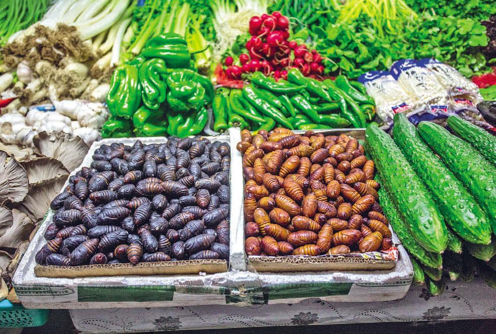 Овощи и жареные насекомые на рынке в Хэйхэ