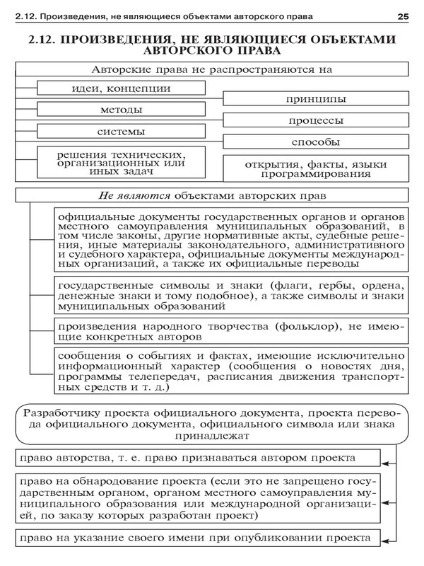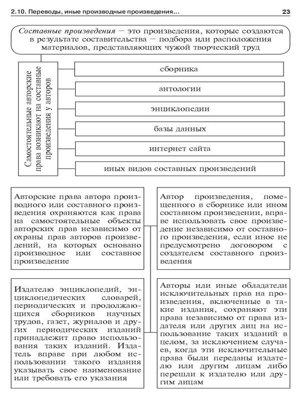 Материалы, отраженные в схематических конструкциях, предназначены как для закрепления теоретических знаний, так и для подготовки к практическим занятиям по соответствующему курсу, особенно при выполнении заданий на логическую последовательность. Для более глубокого изучения теории и практики авторского права, его основных проблем и дискуссионных аспектов к схемам прилагается список литературы, в который включены как общетеоретические работы, так и работы, посвященные отдельным вопросам авторского права.