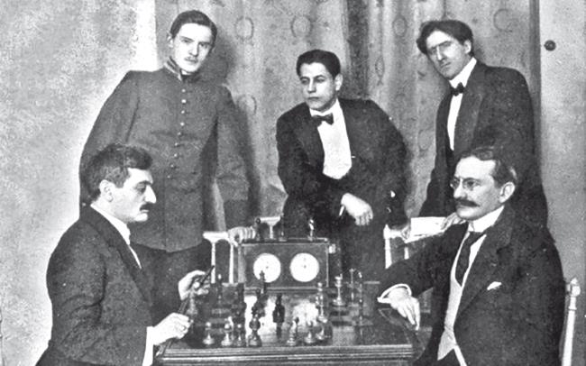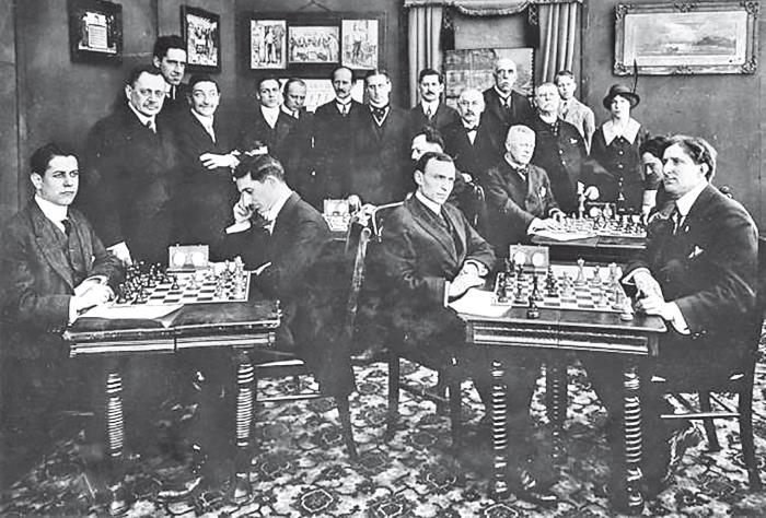 Фото с Петербургского турнира 1914 года, слева направо: Эмануэль Ласкер, Александр Алехин, Хосе-Рауль Капабланка, Фрэнк Маршалл, Зигберт Тарраш