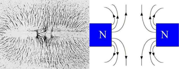 Линейное сгущение опилок и регистрирует силовые линии магнитного поля. Как это происходит? В первом случае – противоположные по знаку зёрна-потенциалы от разных полюсов источников во взаимном магнитностатическом поле уничтожают (интерференция материи полей) друг друга в нитевидных пространствах, уменьшают объём поля, смещают опилки из этих объёмов в соседние, проявляя структуру аннигиляции в виде уже визуальных линий концентрации опилок. Опилки, ранее расположенные на уничтоженных нитях-пространства, сдвигаются-концентрируются и определяют места исчезновения линейного пространства – это и есть силовые линии поля. Этот процесс порождает притяжение источников поля. Во втором случае происходит увеличение объёма поля-пространства и рождаются нитевидные пространства, показывающие направление движение-сдвигания опилок. Этот процесс порождает отталкивание источников. Чем больше концентрация силовых линий, тем сильнее магнитное поле, тем сильнее проявляют себя указанные процессы.