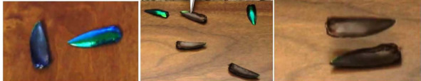 Фото 3.14. Танец надкрыльев Златки (Златоглазки) друг над другом при активации-сброса её с высоты 1—2 см на вторую половинку. Проверено в