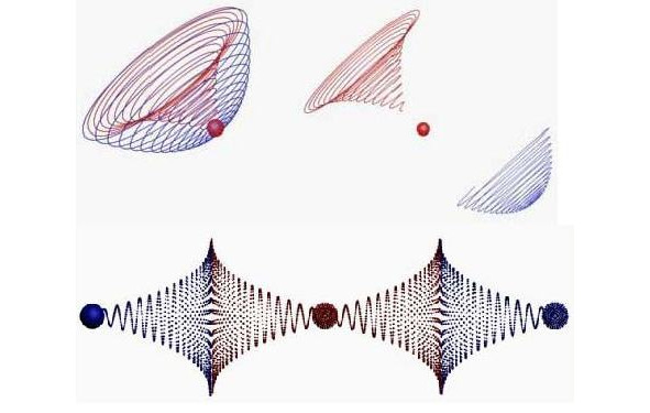 Фото 3.18а. Аналоги-схемы волноводов электрона и звука – характерный вогнутый гравитационный и электрический выпуклый, внизу справа – волновод звука от соответствующих по знаку гравитационных зарядов (+ или -).