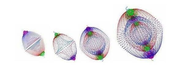 Фото 4. Схемы оболочек нейтрона, слева – направо, внутренняя оболочка, составленная из двух сфер-источников ГЭММ с двумя четверть волноводами (типа нейтрального К-мезона) с полуцелым спином типа мюона; эта же оболочка в реальном виде из зёрен-потенциалов гравитационных внутри и электрических снаружи; две, вложенные друг в друга оболочки первая и средняя; три, вложенные друг в друга оболочки, образующие нейтрон.