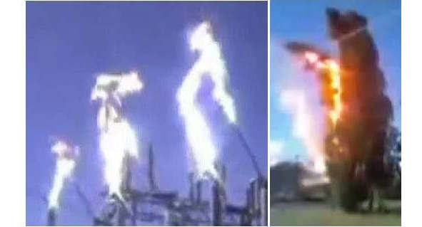 Фото 3.2 Выбросы белого газоподобного облака-пламени из зёрен-электропотенциалов при коммутации-отключения высоковольтных линий электропередач. Вспыхнувший огонь (справа) от переброшенного облака электрического эфира.