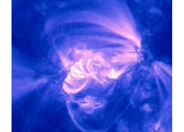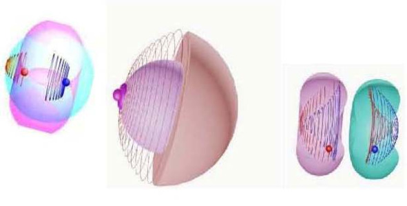 В фазовом объёме на полволны при самодвижении магнитного монополя непрерывно происходит изменение магнитного поля от монопольного (слева) одного знака через дипольное (посредине) к другому монопольному (справа), но другого знака. На фото 8 средняя позиция демонстрирует мгновенное состояние симметричного диполя (розовый двухполюсный тороид) при положении 1/8 первичного моноля от начала фазового объёма, а вторичного монополя на соответствующем расстоянии в 3/8 длины волны. Во всех других положениях поле между монополями будет асимметричным диполем. А в момент подхода первичного монополя к четверти длины волны внешнее магнитное поле будет целиком определятся полем полностью заряженного противоположного монополя. Главной особенностью взаимодействия двух противоположных монополей является то, что они никогда не сближаются на расстояние меньшее четверти длины волны, а пространство между двумя полюсами, помеченное розовым тороидом, не содержит осевого магнитного поля. В этом пространстве присутствует лишь начало недостроенной вторичным монополем спирали волновода электропотенциалов противоположного знака. Активный объём вихрона размером в четверть длины волны всегда содержит первичный разряжающийся монополь, противодействующий этому процессу электрический монополь, им индуктированный вторичный магнитный монополь и часть спирали волновода, установленной уже вторичным монополем, как это демонстрируется кадром (фото 9) симметричного состояния магнитного диполя в хромосфере Солнца.