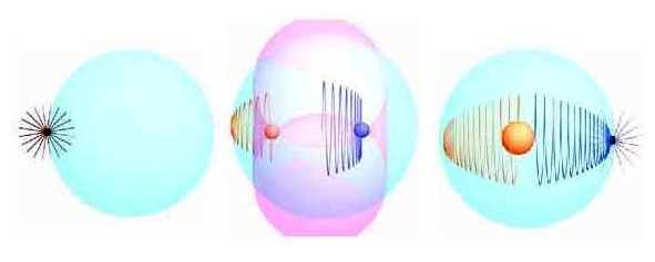 Таким образом, из трека фотона в невещественном пространстве оконтуривается с помощью зёрен-потенциалов линейное вещественное пространство. Затем идёт процесс сворачивания в сферу – объёмное пространство. После чего происходит формирование корпускулярной элементарной материи вещества в виде нейтронов (нейтронные звёзды) путём распада ЧСТ или излучение длинноволновых фотонов.