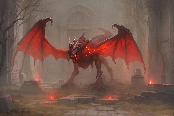 Two red lights burned between the trees. The beast tilted its head to the side, a red line running down its spine to its razor-sharp claws. Its sternum glowed a bright scarlet light from within, illuminating its ribs and the prey it had devoured not so long ago. Another ghastly creature echoed his call. Flaring with infernal fire, it hung from one of the crypt's columns, under the very parapet of the colonnade.