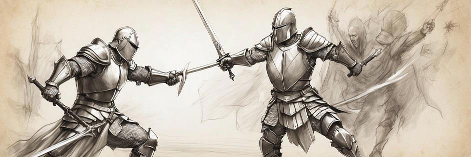 Wymmal rose, intercepted his sword, and lashed out with chopping blows at his opponent. Gracefully parrying the next lunge, Ulrich crouched down and tried to reach his opponent from below, poking him in the other knight's forehead. The one from Fortress Ruch was now helmetless as well. The Herold looked at the Count to see if he had the will to stop the fight, but Theanoth shook his head, willing them to continue. Oh, and could he really stop this fight even if he wanted to? I think so, but then the tournament would not have taken place, and would have been postponed for two weeks at the very least.