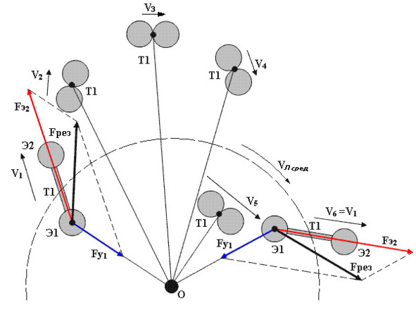 Выше мы рассмотрели физический механизм формирования сил с участием сил инерции при взаимодействии тел вдоль одной прямой линии. При таких взаимодействиях силы инерции влияют на формирование абсолютной величины сил, действующих на взаимодействующие тела. Теперь рассмотрим формирование сил взаимодействия, при котором силы инерции, поддерживающие движение направлены под углом к «обычным» силам, действующим на тело. Такие взаимодействия происходят в частности во вращательном движении.