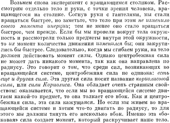 Фейнман удивительно точно отметил, что классическая сила Кориолиса действительно очень странная сила, причём самая странная из всех странных уже по своему определению сил инерции в классической физике. Она настолько странная, что даже сам Фейнман в ней основательно запутался. Обратите внимание, что строго по тексту Фейнмана следует, что боковая фиктивная сила инерции Кориолиса толкает тело в бок и создаёт момент, который раскручивает и гантели, и тело человека. Однако фиктивные силы инерции не могут ничего никуда толкать!