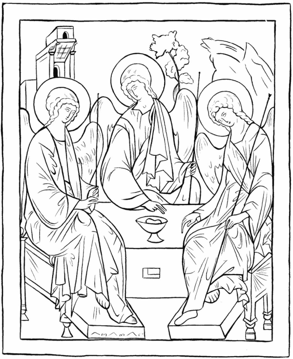 Для Троицкого храма «на похвалу преподобному Сергию» написал Андрей Рублев образ Святой и Живоначальной Троицы. Иконописец изобразил не сам момент явления Троицы Аврааму (Авраама и его жены Сары нет на иконе), но предвечный совет Божественной Троицы, предопределяющий искупительную жертву Христа за грехи человеческие. Два перста Иисуса Христа – центральной фигуры Троицы, изображенной в образе Ангела, – протянуты к искупительной чаше. Господь дает Свое согласие пойти на Крест и пострадать ради спасения людей.