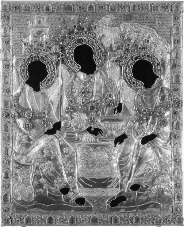 В 1382 году преподобный Стефан – просветитель зырян и епископ Великопермской епархии – написал икону, изобразив рядом с Ангелами Авраама и Сару, а так же древо с тремя ветвями, из которого, по преданию, сделают крест, на котором распнут Христа. На столе он изобразил не блюдо с яствами, как прежде писали иконописцы, а лишь одну единственную чашу – символ Святого Причастия.